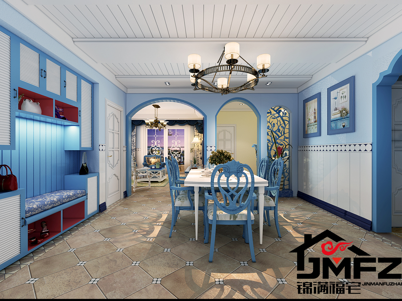 设计说明:这是一套三室两厅一厨两卫的户型,整体装修风格为地中海风格。整体色调以蓝色与白色为主,这种色调搭配也是比较典型的地中海颜色搭配。电视墙做了一个对称的造型,两边镂空花格加银镜也显得比较大气。门洞多采用拱形门洞,更加体现了地中海风格。根据客户的生活需求以及对客户的了解,本设计对墙体进行了一个小小的改造,将客卧室门口那面墙直接打掉改成了一间开放式书房,门口旁边很贴心的做了一个小吧台,同时也满足了一个休闲的区域。整体色调造型上看着比较干净舒服。